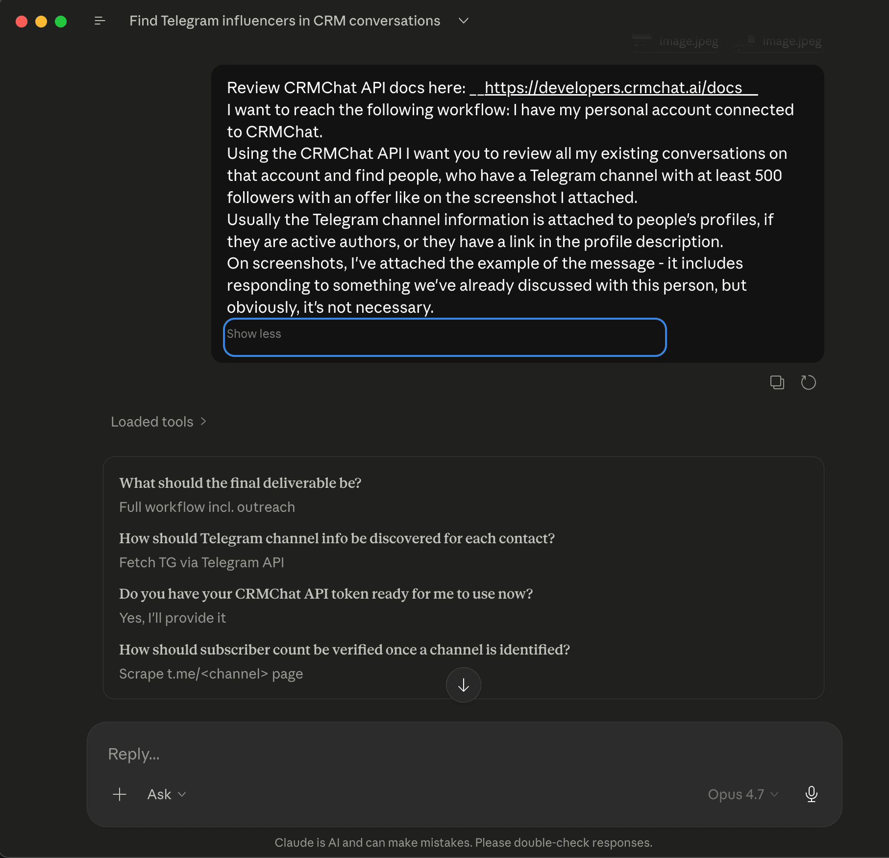 Envoi de messages privés personnalisés aux propriétaires de chaînes Telegram, en utilisant uniquement l’API CRMChat, ma propre liste de contacts et un assistant IA qui recueille le contexte avant de rédiger.