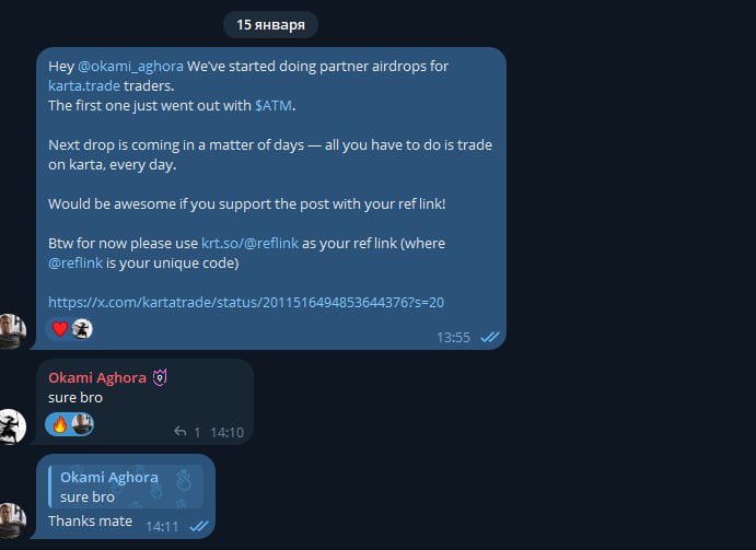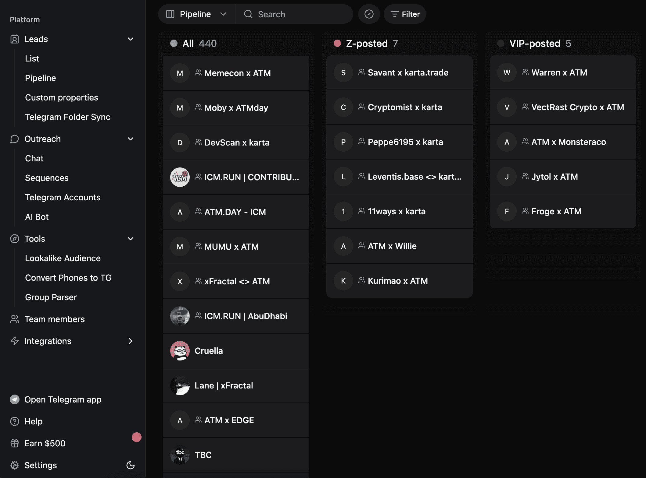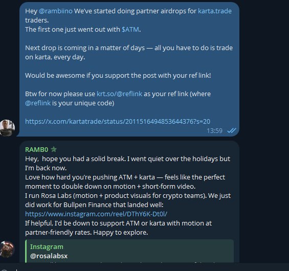 Коли ATM.day уклав партнерство з karta.trade для airdrops, їм довелося охопити всю мережу KOLs за години, а не дні. Традиційні CRM не працюють, оскільки крипто KOLs не перевіряють електронну пошту — вони живуть у Telegram.