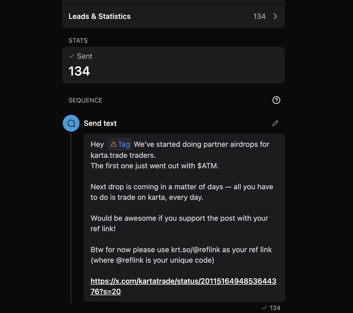 134 повідомлення надіслано за хвилини для airdrop-кампанії karta.trade